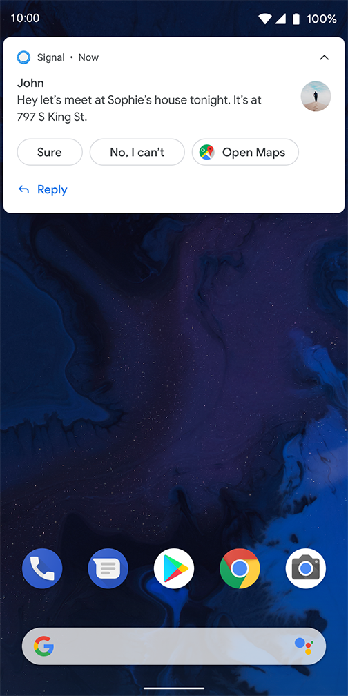 Suggested Actions lets you take action with a tap. For example, if a friend texts you an address, you can launch Google Maps directly from the notification. No need to copy and paste.